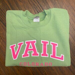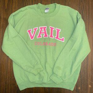 Vail, CO graphic lime green pull over crewneck. Brand is Gildan.