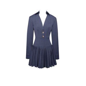 Experience timeless style with the Val Denim-style Mini Dress in Navy Blue. The soft denim-like fabric offers superior comfort, while the classic flat collar, long sleeves, and elegant gold buttons add sophisticated touches. The drop waist design and wide waistband accentuate your silhouette, flowing into graceful pleats for a feminine movement. With full lining for comfort and structure, this dress effortlessly combines casual charm and polished elegance.