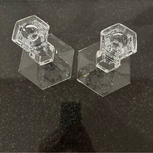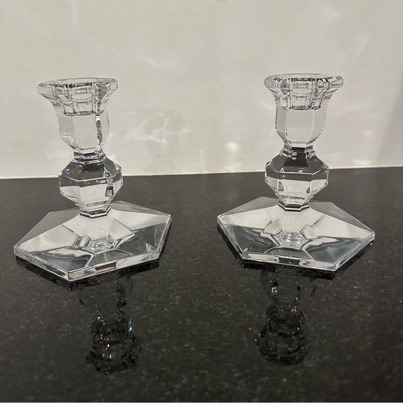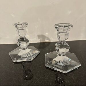 Set of two Val st. Lambert Elegant crystal candle holders perfect for adding a touch of sophistication to any room. The clear design complements any decor style. Perfect for holidays, Christmas, wedding,