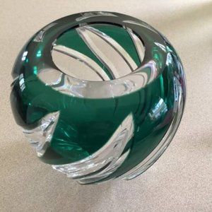 Beautifully designed, elegantly executed. This master creation from the artisans at Val St. Lambert measures 6" x 6"and glows with the emerald green flowing through the flashed crystal vase with an upward swirl design. Etched Val St. Lambert signature on the bottom. 9.5 out of 10 with slight scuff on the base. Make it yours today and enjoy the crystal wonder of craftsmanship. .
