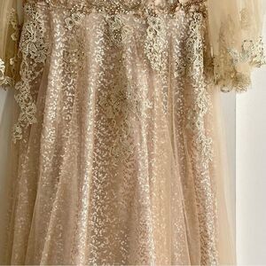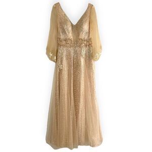 Val Stefani V-Cut Tulle Overlay Sleeve Sequin Bead Lace Embellished Gown Dress