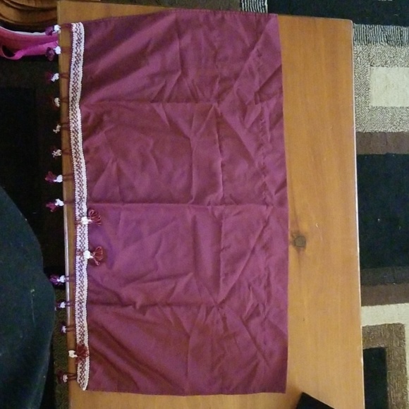 Burgundy with white trim and tassels valance. Smoke/Pet Free home. No rips/tears/stains. Pre-owned. Matches the swag curtains I have posted.