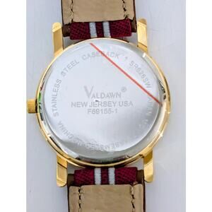 NWOT Valdawn quartz watch with American flag dial and red white blue leather strap. Gold tone case, stainless steel back, Japan movement assembled in China. Working with new battery installed.