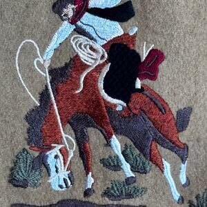 This Valencia Western wool jacket showcases detailed cowboy-and-horse embroidery, classic ranch symbols, and metal stud trim for an authentic vintage Western aesthetic. Its warm wool blend and fully lined interior make it ideal for fall and winter wear.