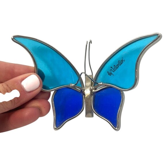 This elegant suncatcher from Valentien adds a vibrant touch to any space with its blue glass butterfly design. Ideal for brightening windows.