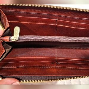 Stylish brown wallet with a textured design. Features a metallic logo accent.