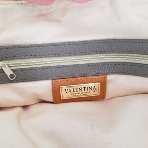 Gently used Valentina Italian Pebbled Leather Shoulder Bag. Color is gray with tan piping.