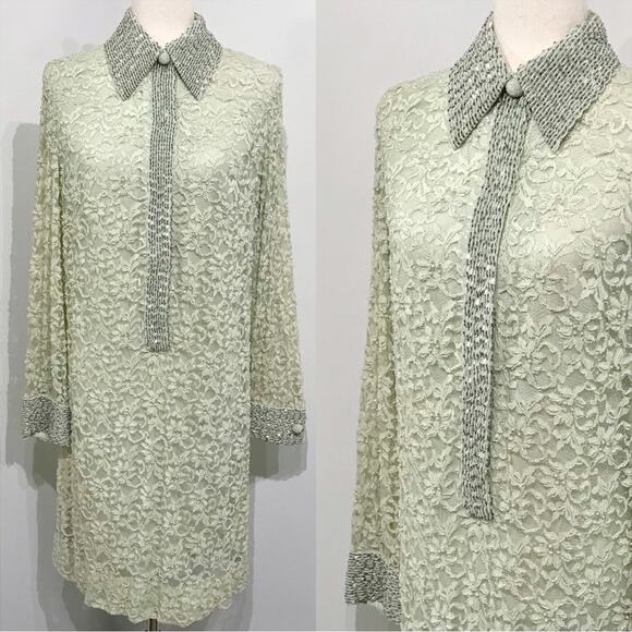 Valentina Ltd 1960s Embroidered Beaded Lace Long Sleeve Tunic Dress 14 VTG 10 to