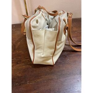 Features: Dual tan leather shoulder straps, Gold-tone hardware, Front logo plaque, Interior zip pocket, Interior slip pocket, Secure zip-top closure, Sturdy base with protective metal feet, Spacious interior