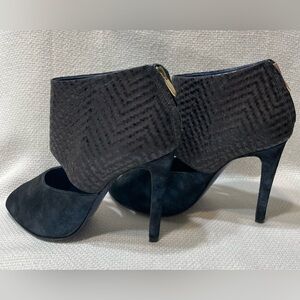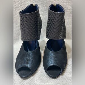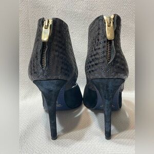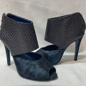 Stunning pair of booties! EUC. Very little wear on soles. No visible scuffs or marks. Peep toe. Back zipper. Cuff has a chevron type pattern. Front or shoe has a metallic blue look. Great with a skirt, trousers or jeans! Made in Italy