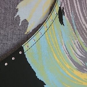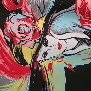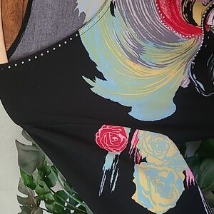 NWOT. Swirls of color in abstract design surround the lady and her red roses. Rhinestone enhanced. Print carries to the sleeve as well as to the back.