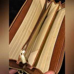 Stylish Valentina wallet in tan leather. Features a gold zipper and multiple compartments.