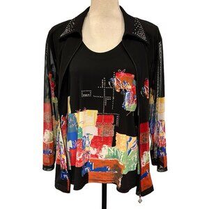 Valentina Twin Set Black Semi Sheer Chiffon Jacket Tank Set Multicolor Geo Artsy