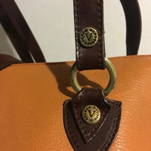 Authentic Valentina mustard / Burgundy leather satchel handbag with gold-tone hardware ltaly made with Valentina satin lining 3 compartment 2 pocket at interior wall 1 zip closure on wall 1 at the center & 1 at the top exterior The corners and the bottom and have a little stains please check photos