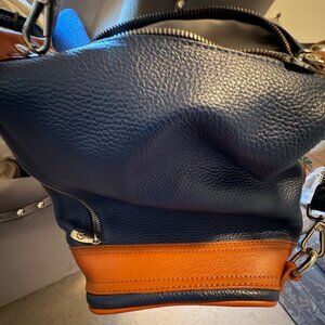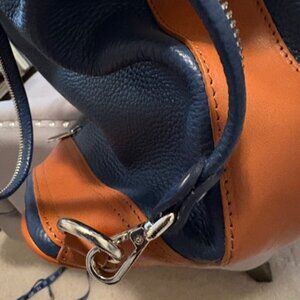 Valentina purse and convertible backpack in blue leather with brown trim. Lots of zipper pockets. Approx 12 inches tall in inside space, but has shoulder handle with zipper that unzips to convert to backpack. Several inside compartments.