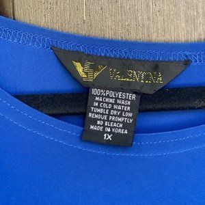 Nice royal blue top size 1X by Valentina. 3/4 sleeve, V-cut on sides. I am 5'8" and this hangs on lower hips. 100% polyester.