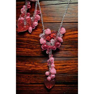 Fun and bright Valentine beaded jewelry set. It includes a necklace and a matching bracelet. Both are on silver tone chains with lobster clasp closures. They both have a variety of matching beads including red and pink faux pearl beads, clear faceted beads, opaque pink hearts, and translucent red hearts. Super cute!
