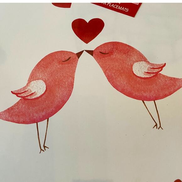 Add a touch of love to your Valentine's Day dinner with this set of four Colordrift placemats. This set is perfect for protecting your table while adding a decorative and romantic touch to your dining experience. A romantic and playful illustration of two red birds kissing with hearts above them. The border is adorned with a ring of small red hearts, perfect for a Valentine's Day or love-themed setting.