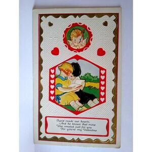 Valentine Postcard Cupid Watches Children Reading Book Embossed Series 448