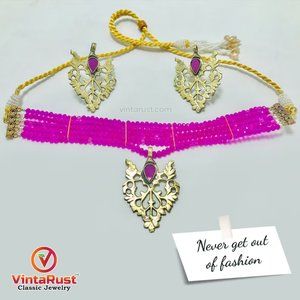 The multilayer tribal choker necklace has tiny red beads beaded elegantly. An antique floral leave pendant is inlaid in the center of the choker. The rustic hues of this metallic choker are giving vintage vibes. This extremely charming jewelry set is one of the praiseworthy pieces.