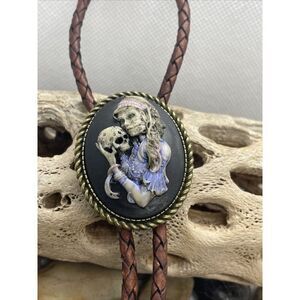 This stunning bolo tie from FANCY FOX BOUTIQUE features a beautiful brown RESIN CAMEO with a sugar skull Mexican design. The oval-shaped cameo is set in a bronze metal frame with silver base metal, complemented by a 37 inch cord made of high-quality leather. The tie is perfect for any occasion, from engagements and weddings to birthdays and graduations. It also makes a great gift for Mother's Day, Father's Day, Valentine's Day, and Christmas.