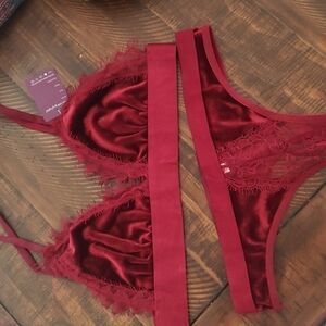 size small. color is a burgandy velvet. unlined bra cup with 2 hook closure in back. features beautiful lace edging. thong is velvet with same lace trim great for a special Christmas stocking