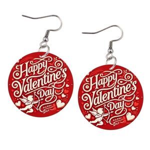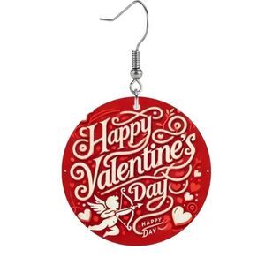 A Pair of Acrylic 2D Valentine'S Day Theme Pendant Earrings, Fashionable Red Disc-Shaped Letters Printed Love Heart Art Earrings