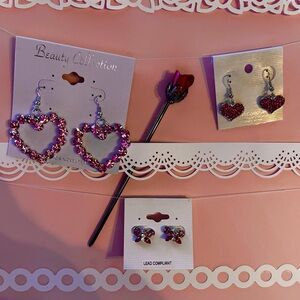 Incredible value! One pair of large pink heart earrings, one pair small pink heart dangle earrings, one pair of small pink butterfly stud earrings and one red rose metal hair bun pin!
