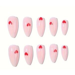 Valentine's Day Almond Press on Nails Red Heart Nude False Art 24pcs Stiletto Short