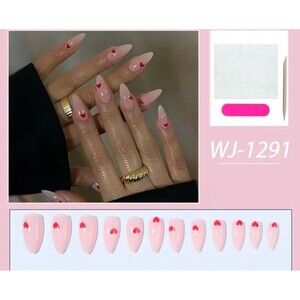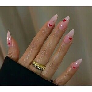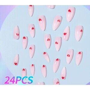 Valentine's Day Almond Press on Nails Red Heart Nude False Art 24pcs FAST SHIP!