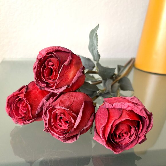 Valentine's Day Deep Red Bundle 5 Long Stem Burnt Edge Roses Artificial Flowers