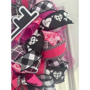 Beautiful handmade Mesh Wreath embellished with a heart & key sign surrounded by beautiful coordinating Valentines Day ribbons.