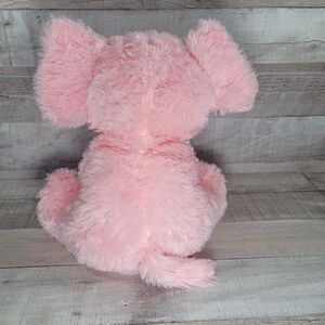 Adorable soft shaggy floppy pink elephant plush has a shiny stuffed heart hanging from its trunk, shiny heart shaped ear accents and shiny feet. This stuffed animal measures approximately 12 inches tall in flopped sitting position and is in good gently loved condition. NOTE: there is orange thread on bottom of heart indicating a possible repair. Some of the threads/fill in the face are dark and visible between/above eye area.