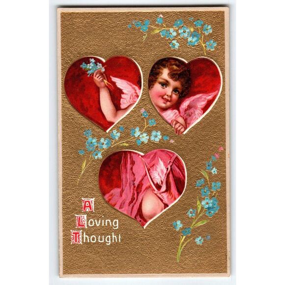 Valentines Day Postcard Cherub Looks Through 3 Hearts A Loving Thought
