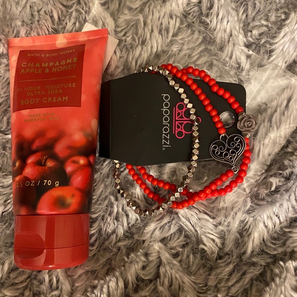 Bath and Bodyworks hand lotion Champagne apple and honey scent and the paparazzi bracelet stretchy Be a cute Valentine's Day gift