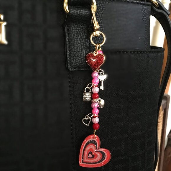 Colorful red, pink and white hand strung pearlized beads, jeweled separators, with glitter puff heart and large flat heart. Smaller charms include heart key, lock, open heart and solid heart. Fun piece dress up your bag to celebrate Valentine's Day. Approximately 5 inches long.