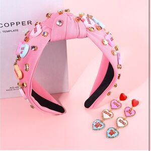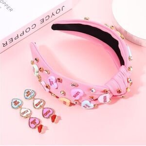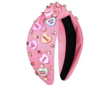 Valentines headband features white/red/pink wide top knot headband, embellished with conversation love heart charms. Handcrafted with a stretchy knit fabric, crystal and acrylic, comfortable and stretchable, smooth surfaces won't slip off easily, and will hold your hair tightly no matter for long, short, curly and straight hair.