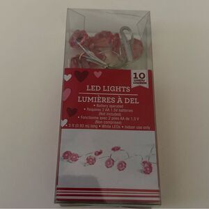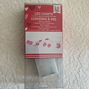 New in box. Valentine's Day LED string lights, 3 foot strand. Perfect for decorating centerpieces, mantels, and wreaths. Battery operated.