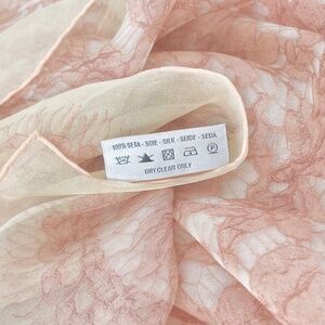 Whisper-soft, semi-sheer silk features a digital print of pink, scalloped-edge, floral Guipure lace against a white background and blush or nude-colored border. 1/16" hand-stitched rolled hems. Generously sized at 26 in. wide x 78 in. Made in Italy 🇮🇹. Dry clean only.