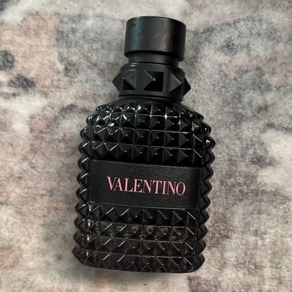 Chic Valentino bottle with black studs and pink accents. Bold and fashionable design.