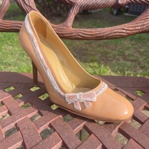 Valentino Apricot Bow Detail Round Toe Wood Stacked Heel Pumps
