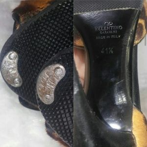 Gently previously loved! Authentic quality Italian made leather and fur, leopard print Valentino Garavani open side heels with pretty bow top. All angles of shoes in photos, including proofs of authenticity. Minimal signs of wear when on. Light scuffing on heels and under soles. Scuffing on insoles, not visible when on. Light wear on fur of left, right above heel. All as pictured. 3.75" heel. Size 41 1/2.
