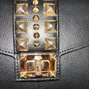 Sleek black Valentino bag with bold gold studs. Perfect for adding edge to any outfit. Stylish and versatile.