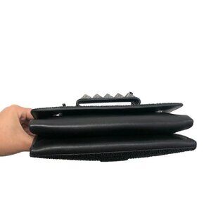 Made in Italy, this absolutely stunning soft leather and black crystal encrusted evening bag features gunmetal fittings and accents, a front black crystal encrusted pyramid studded clutch handle, gunmetal chain strap, double snap flap closure that opens to a black leather and fabric interior that includes 2 compartmental areas and 1 open pocket. This bag is in excellent condition and comes with a dust cover. This bag retailed for $2995
