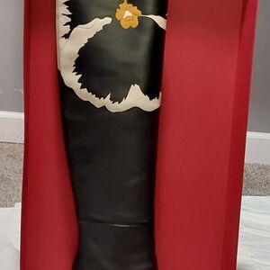 Elegant knee-high boots with a striking floral design. Features a bold black color with cream and tan accents.