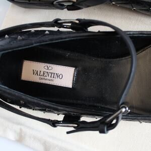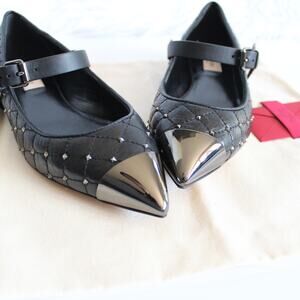 Valentino Black Quilted Leather Rockstud Cap Toe Point Mary Jane Ballet Flats