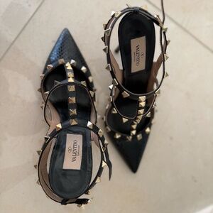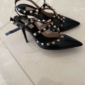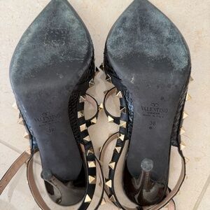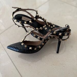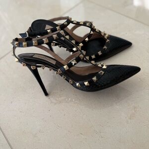 Valentino Black Snakeskin and Patent Leather Rockstud Ankle Strap Pumps Size 37.5. Great condition, barely worn. Clean soles, pristine upper, and all studs intact. 100% authentic.