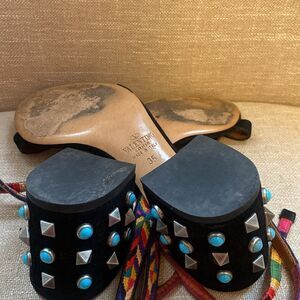 another design with these rockstud sandals. More than a simple black suede sandal, it's the chic detailing that makes these a classic Valentino creation. A wrap-around multicolored embroidered ankle lace strap offers tie closure. Curving around the block heel and open toe band is a platinum-finish rockstud appliques with turquoise cabochon stone trimming. A rounded toe and thick 60mm block heels make these sandals perfect for upcoming elegant events or a stylish day at the office. Made in Italy.