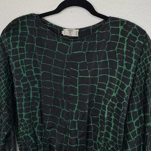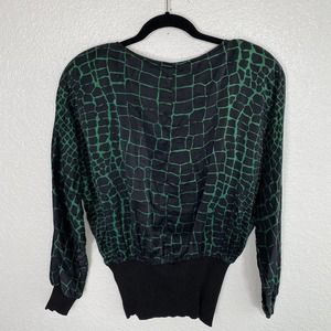 Elegant blouse with a striking croc print. Features a black and green color scheme. Perfect for a chic look.