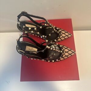 Elegant Valentino heels with striking black and nude design. Features signature studded accents. Perfect for elevating any outfit.